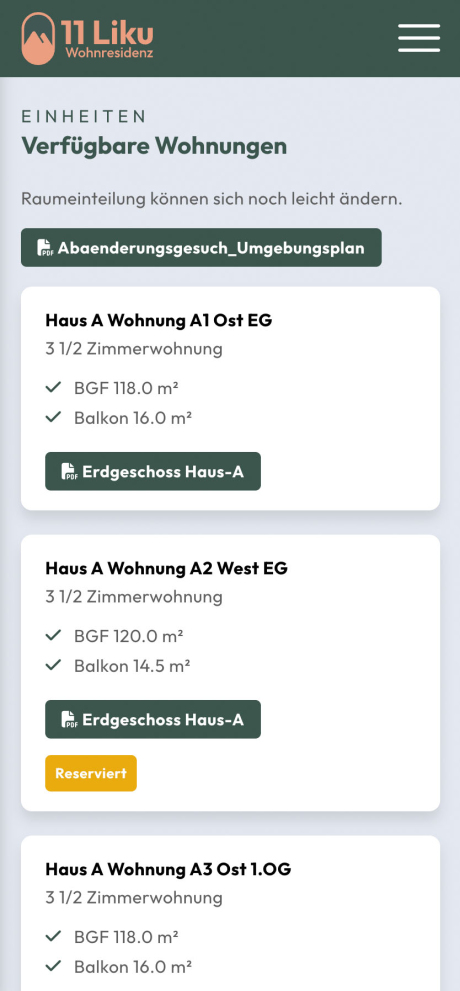 Für die Online-Vermarktung nutzt der Bauherr, die Constantin AG, einen One-Pager. Auf diesem sind alle wichtigen Informationen zum Projekt, zur Umgebung sowie zu den baulichen Details der Überbauung und Wohnungen übersichtlich dargestellt. Zusätzlich kann der Benutzer über eine seitliche Navigation auf die gewünschten Inhalte zugreifen. Grossflächige Bilder lockern das Erscheinungsbild des One-Pagers auf und gewähren gleichzeitig einen Blick auf die Residenz. Dank der Tags-Funktion in unserem CMS können Wohnungen einfach als «Reserviert» oder «Verkauft» markiert werden. Umfangreiche Inhalte werden mit einer Ausklappfunktion (Akkordeon) dargestellt, um die Übersichtlichkeit des One-Pagers zu bewahren.