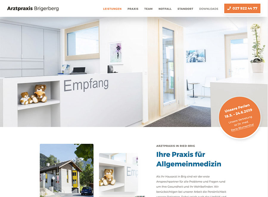Mit der neuen One-Pager-Website hat die Arztpraxis Brigerberg aus Ried-Brig eine digitale Eingangstür zur Praxis geschaffen. Hier entsteht der erste Eindruck über die Ärzte und Ihre Tätigkeit. Ihre Kompetenz spiegelt sich im Design, in der Funktionalität und in den Bildern wider.