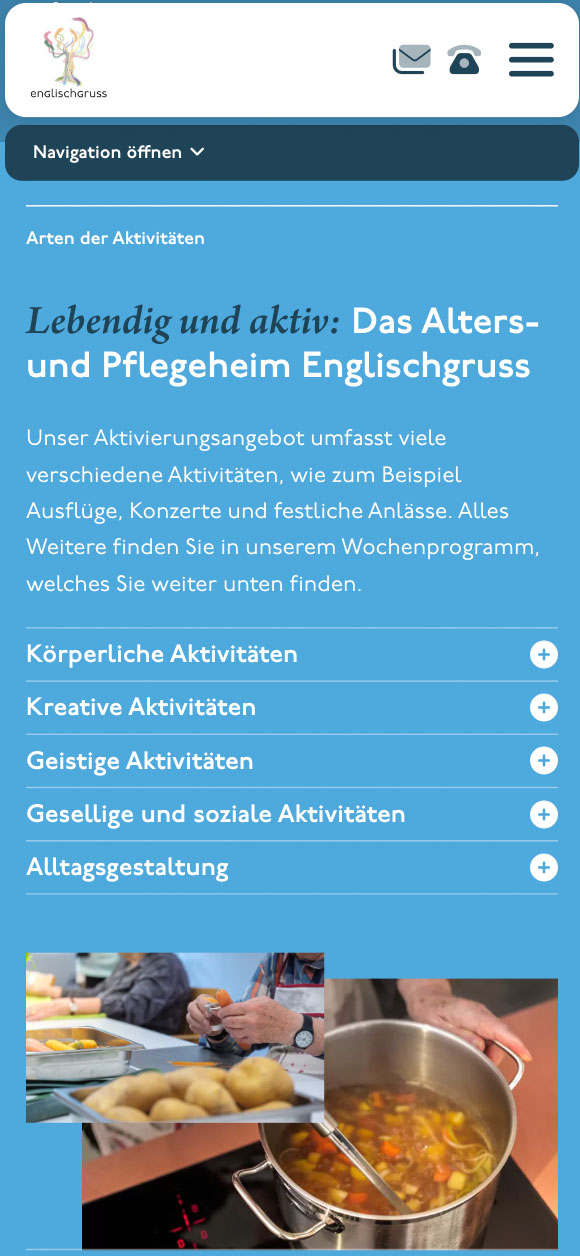 Gut organisiert - auch im Web. Seit der Eröffnung im Jahr 1992 hat das Alters- und Pflegeheim «Englischgruss» sein Angebot und die Räumlichkeiten kontinuierlich erweitert. Es bietet älteren Menschen mit Betreuungsbedarf ein gemütliches Zuhause.
