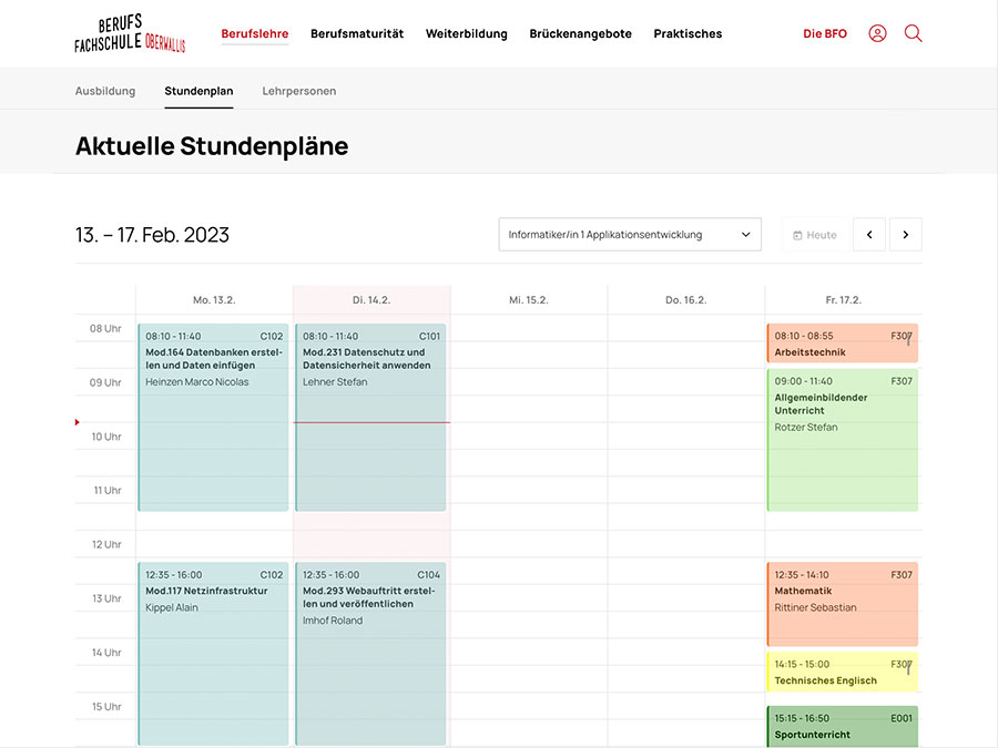 Unser hauseigenes CMS bildet die Grundlage für die umfassende Online-Plattform, die zahlreiche Funktionen bietet. Besonders beeindruckend sind die interaktiven Stundenpläne, die für jede Berufs- und BM-Klasse individuell gestaltet und automatisiert wurden, um damit den heutigen Bedürfnissen der Nutzer gerecht zu werden. Die jeweiligen Lehrpersonen pro Beruf werden automatisch auf den entsprechenden Seiten dynamisch geladen und angezeigt. Moderne Bedienelemente wie Akkordeon, Slider und Anker-Links ermöglichen eine intuitive Navigation und erhöhen die Nutzerfreundlichkeit erheblich.