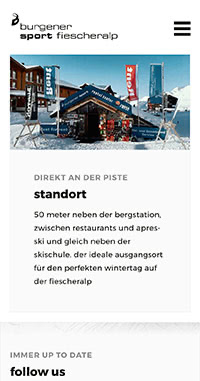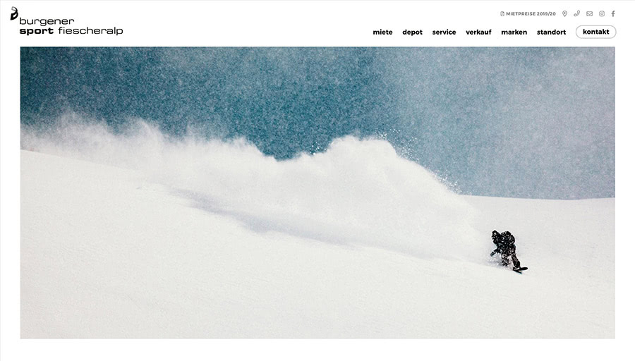 Das Sportgeschäft direkt an der Piste der Fischeralp präsentiert sich online schlicht und zeitlos auf einer One-Page-Scroll Website.