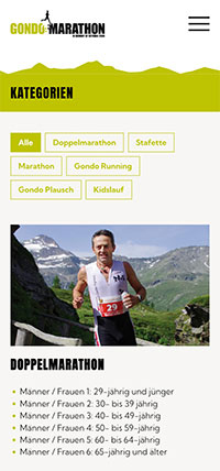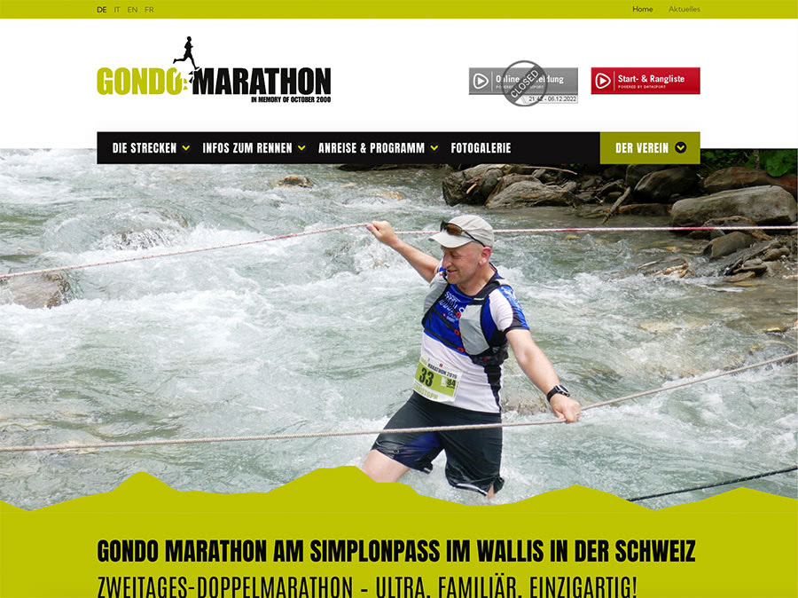 Die Navigation ist einfach und benutzerfreundlich, so dass du dich schnell orientieren und alle wichtigen Informationen findest. Du kannst dich direkt über einen der sechs angebotenen Läufe informieren. Während du dich auf den grossen Tag vorbereitest, hast du Zugang zu umfassenden Informationen über Streckenbeschreibungen, Kategorien, Renn-Infos, Resultate und andere wertvolle Tipps. Auf der Website findest du auch eine Liste der Sponsoren, eine Galerie mit Fotos von vergangenen Veranstaltungen sowie Anreise nach Gondo, das Rahmenprogramm und Essen & Unterkunft vor Ort. Die Website ist in mehreren Sprachen verfügbar, um auch ausländische Teilnehmer bestmöglich zu informieren.
