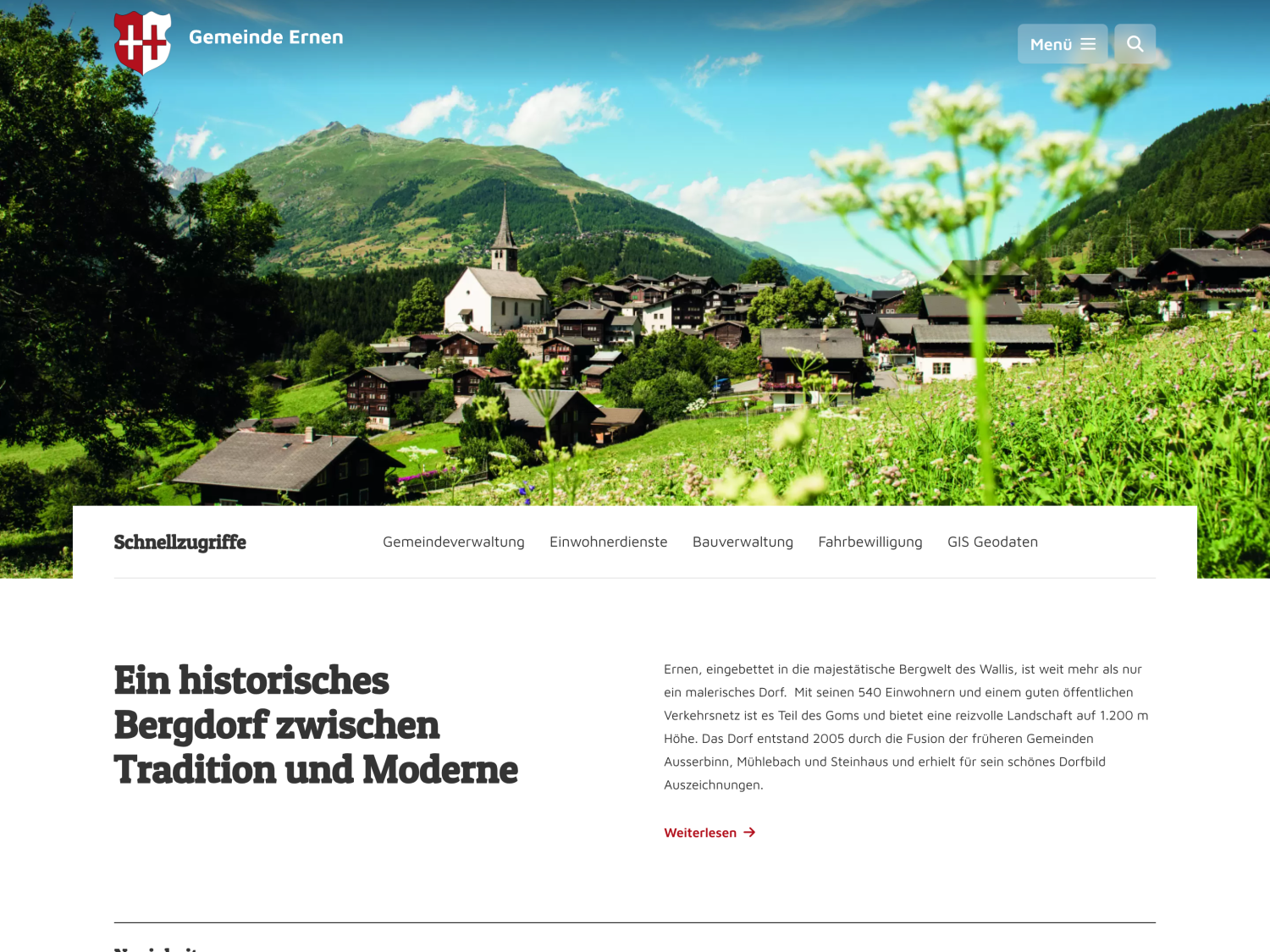 Ein historisches Bergdorf zwischen Tradition und Moderne. Die Webseite der Gemeinde Ernen bietet Einwohnern und Gästen alles Wichtige rund ums Leben, Bauen und Mitgestalten im malerischen Dorf.