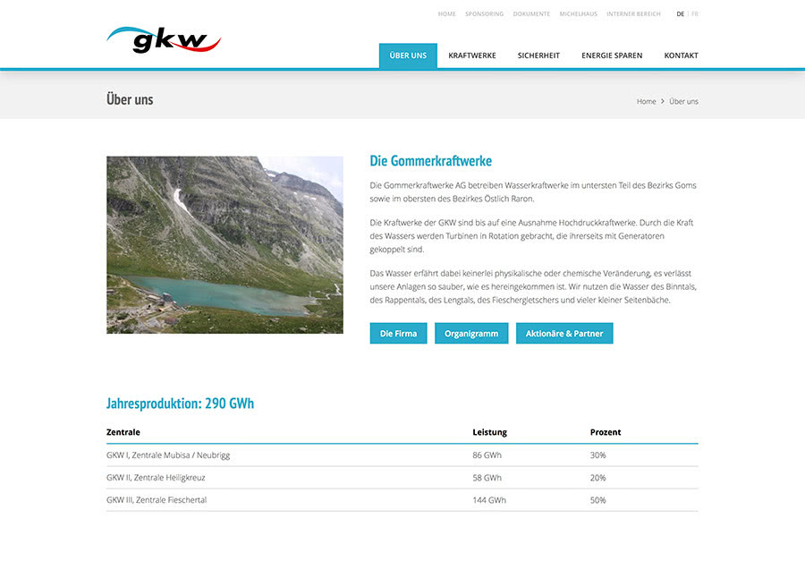 Die Gommerkraftwerke AG, welche Elektrische Energie ausschliesslich aus Walliser Wasserkraft produziert, hat sich entschlossen Ihre bestehende Seite nochmals professionell programmieren zu lassen, und hat mit uns einen lokalen Partner im Wallis gefunden, welcher bei Fragen stehts zur Stelle steht.