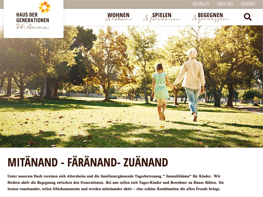 Wir durften für das Haus der Generationen St. Anna in Steg eine umfangreiche Website erstellen. Ganz nach dem Motto «Mitänand - Färänand - Zuänand» werden alle nützliche Informationen über angebotene Dienstleistungen, Lage, Öffnungszeiten und Kontakte einfach zugänglich dargestellt.