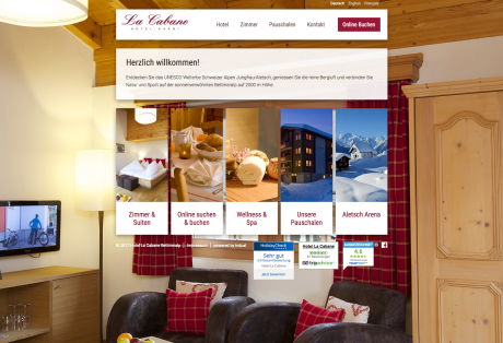 Die in Joomla entwickelte Webseite des Hotel La Cabane auf der Bettmeralp wurde in unser firmeneigenes Content Management System phpComasy übernommen und dabei wurde das Erscheinungsbild modernisiert. Der schlichte, jedoch moderne Webauftritt informiert den Besucher optimal vor seinem Aufenthalt und lässt bereits Vorfreude aufkommen.
