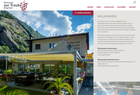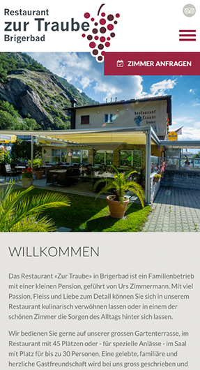 Das Hotel-Restaurant «Zur Traube» in Brigerbad ist ein Familienbetrieb mit einer kleinen Pension. Mit viel Passion, Fleiss und Liebe zum Detail können Sie sich im Restaurant kulinarisch verwöhnen lassen oder in einem der schönen Zimmer die Sorgen des Alltags hinter sich lassen.