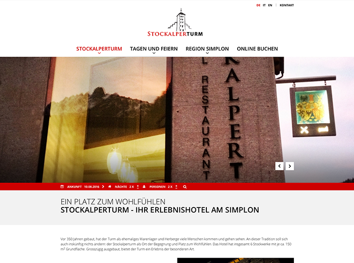 Die neue Hotel Stockalperturm Webseite kommt mit einem modernem Webdesign daher. Grosse Bilder, ein einheitliches Seiten-Konzept und eine moderne Dropdown-Navigation runden das Ganze ab.