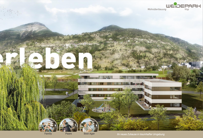 Die Überbauung «Weidepark» liegt in einer Umgebung mit hohen Wohn- und Freizeitqualitäten, an äusserst ruhiger Lage und trotzdem zentral. Sie geniessen einen unverbaubaren Blick ins Grüne: einerseits das Rhonetal auf- und abwärts, andererseits aber auch direkt die beeindruckende Walliser Bergwelt.