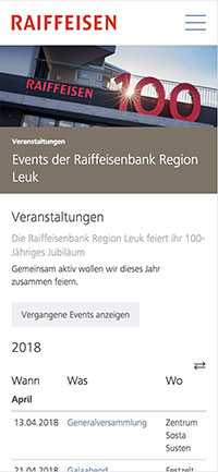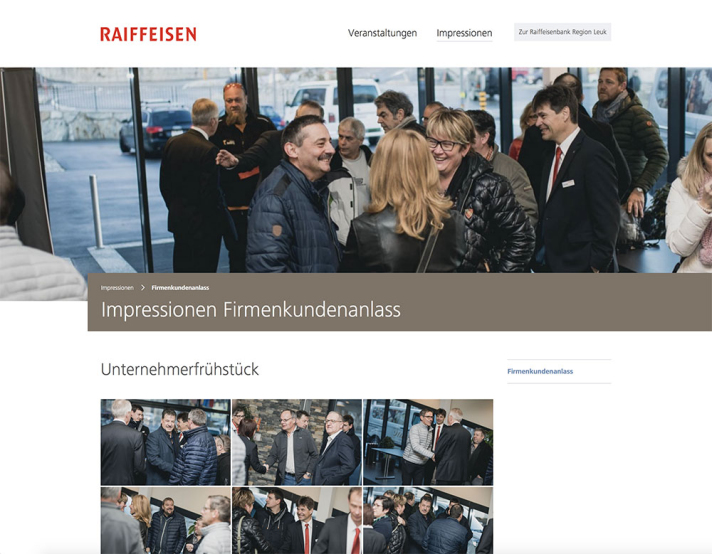 Die Raiffeisen Bank Region Leuk feiert seinen 100 jährigen Geburtstag. Viele Events stehen im Jubiläumsjahr an. Um die Events und die Impressionen mit allen teilen zu können, wurde dafür eine eigene Webseite programmiert und eingerichtet.