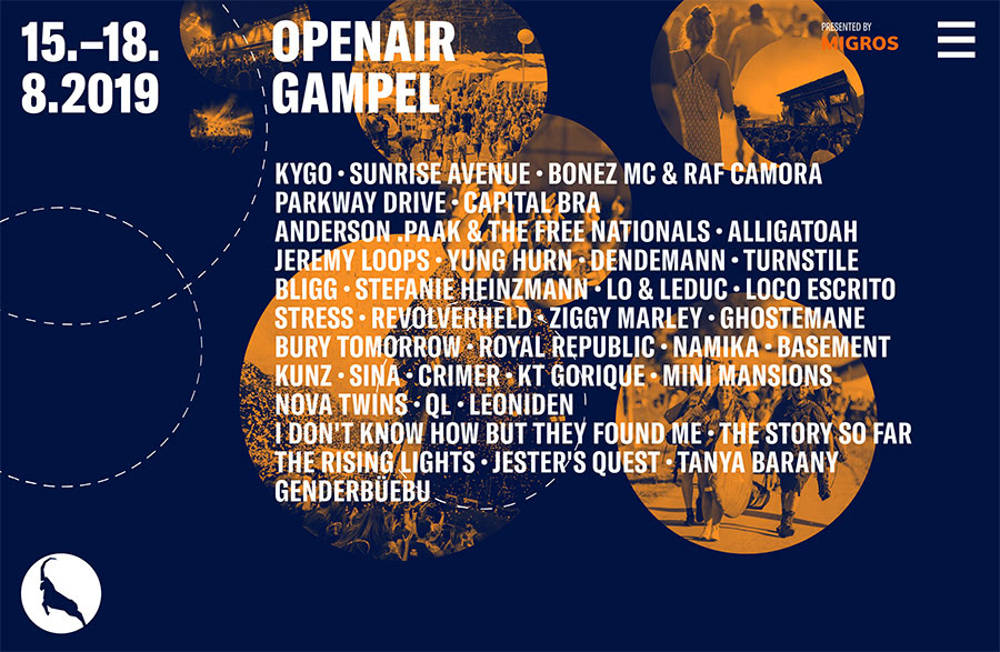Orange und Blau sind die Farben des Open Air Gampel 2019 – Und bunt ist auch die Mischung der Musik: Rock, Rap und Hip-Hop, erfrischendes Summer-Feeling, Schweizer Top-Acts und «ds’beschta fam Wallis»!