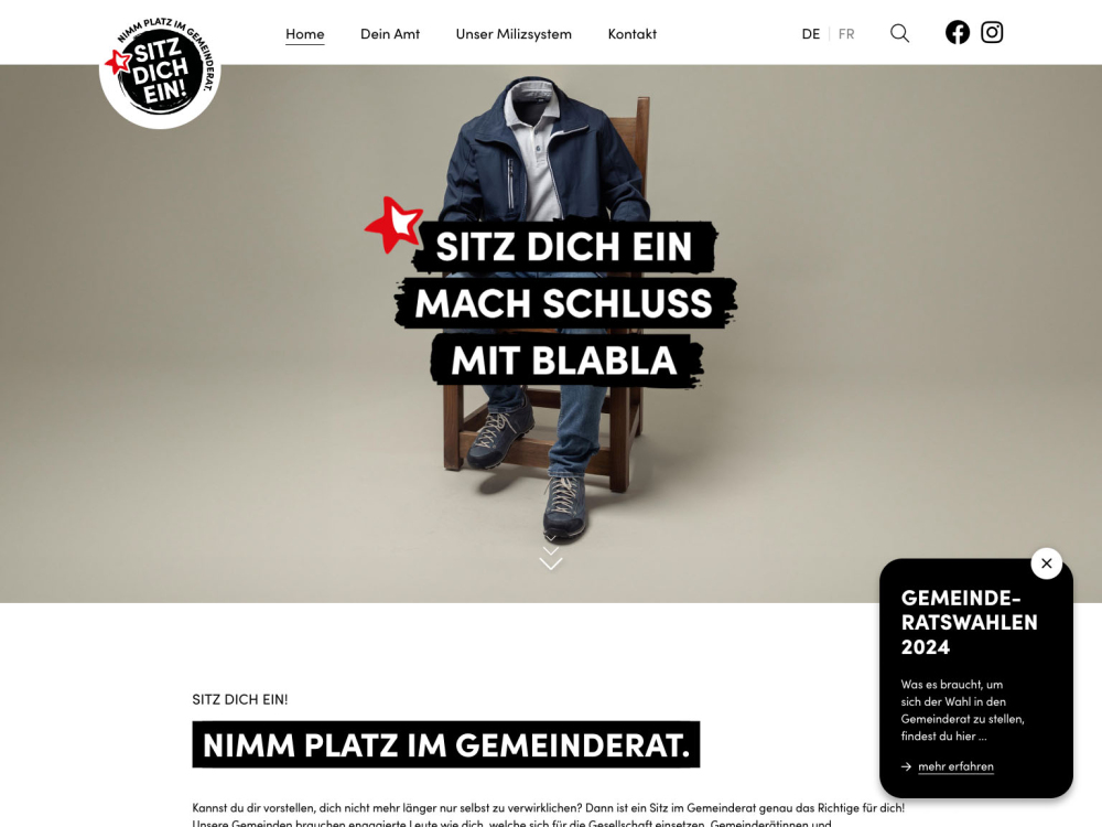 Die Sensibilisierungskampagne «SitzDichEin!» wurde durch den Verein Region Oberwallis und die Antenne Région Valais romand in Zusammenarbeit mit dem Verband Walliser Gemeinden lanciert. Ziel der Kampagne ist es, das Interesse und Engagement der Bürger:innen für die lokale Politik zu fördern und für eine Kandidatur im Gemeinderat zu gewinnen.