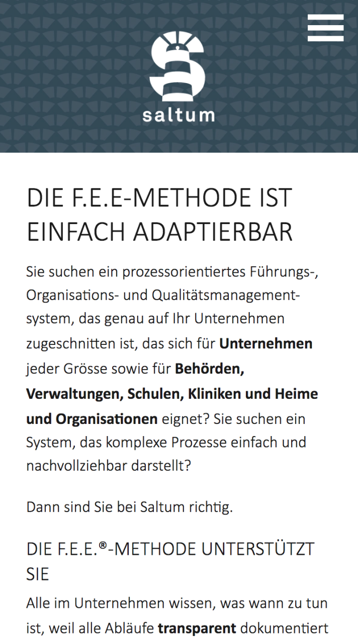 «Es gibt keine Probleme, es gibt nur Situationen, an denen es eine neue Lösung braucht!» Nach diesem Leitsatz arbeitet Saltum im Bereich Qualtäts- und Projekt-Management sowie Strategie, die entwickelte F.F.E.®-Methode hilft dabei effizient das gewünschten Ziel zu erreichen.
