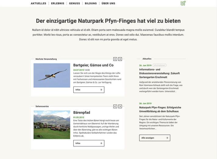 So vielseitig wie der Naturpark Pfyn-Finges mit Berg-, Tal- und Waldlandschaft, mit Wander- und Radwegen, Wein und Bartgeiern – so sollte auch die Homepage sein. Denn die Homepage ist die erste Seite, die ein Besucher sieht. Mitsamt einem Refresh des Designs haben wir die Startseite neu konzipiert.