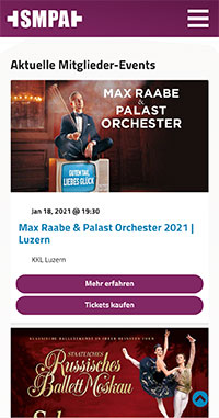 Alle Veranstaltungen der Mitglieder werden prominenten auf der Startseite publiziert. Die Daten werden direkt von Facebook importiert und dynamisch ans Design angepasst. Auch alle SMPA-Mitglieder können mit wenigen Mausklicks integriert und übersichtlich der Öffentlichkeit gezeigt werden.