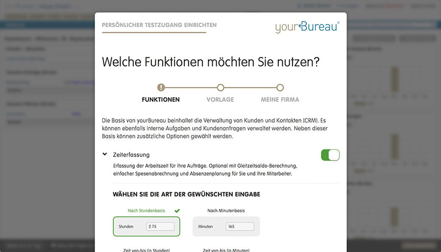 Mit unserem Assistent machen wir es Ihnen noch einfacher yourBureau auszuprobieren. Richten Sie in 3 Schritten Ihr ganz persönliches yourBureau ein und probieren Sie alle Funktionen 30 Tage kostenlos und unverbindlich aus.