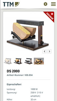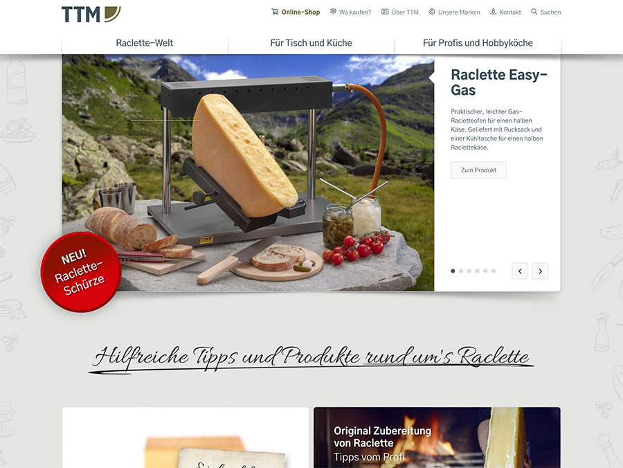 • Umfangreicher, moderner Online-Shop mit Produkten für Raclette und Gastronomie